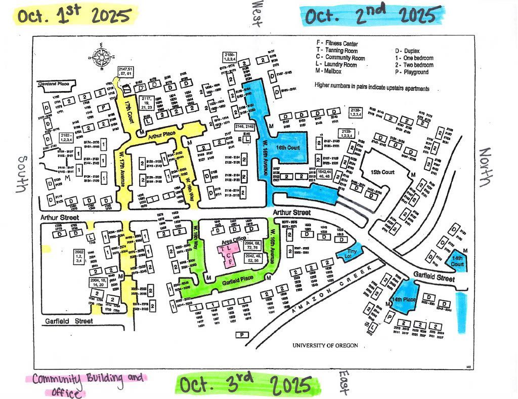 Attached is a highlighted map of the property that indicates which day each parking lot will be done. It is required that ALL vehicles be removed from the specific parking lots during the below days and times.